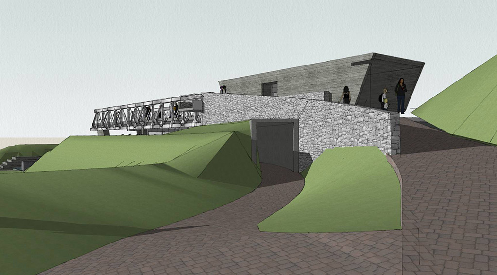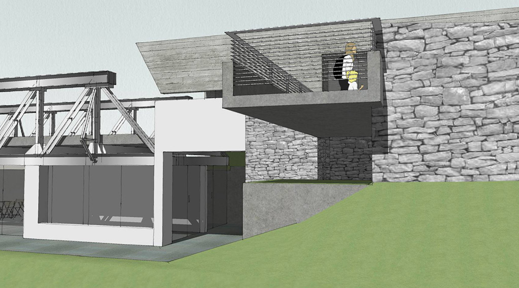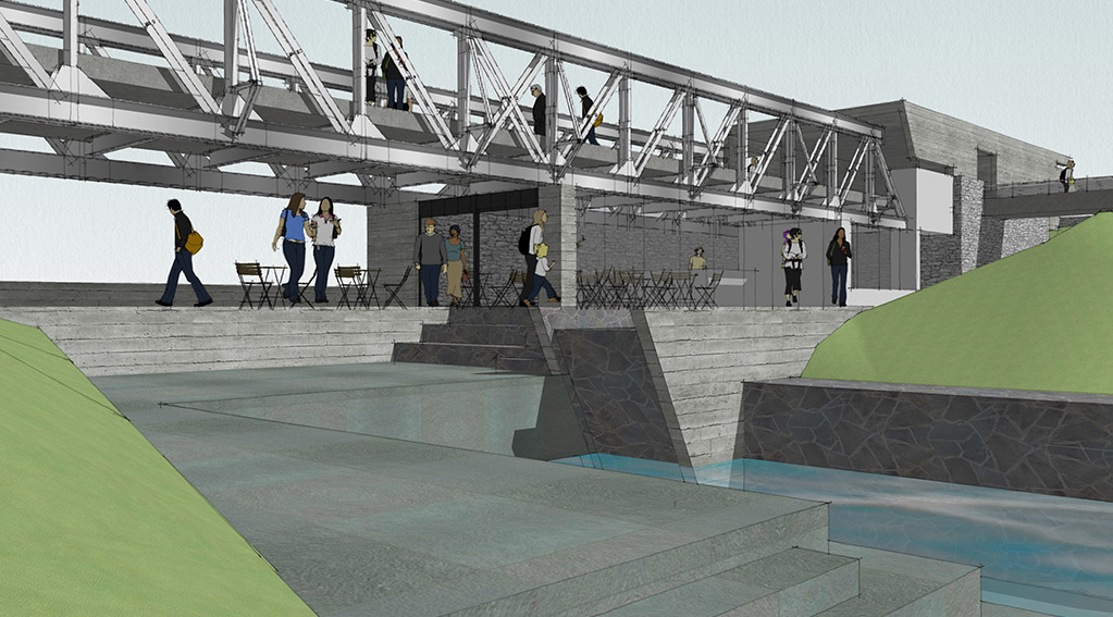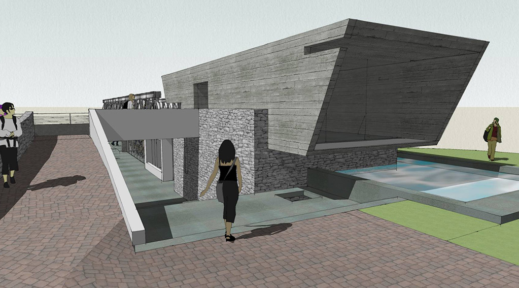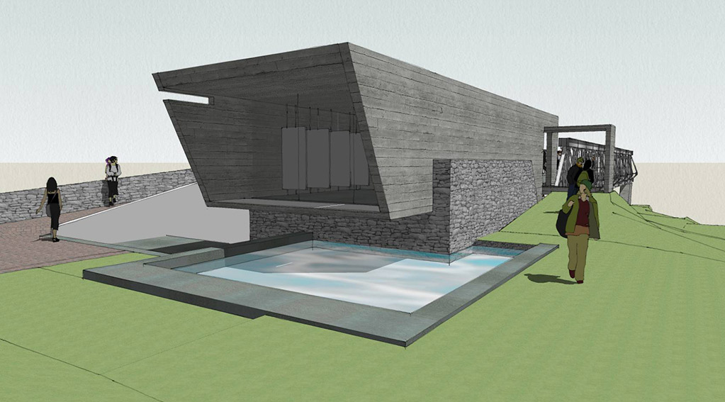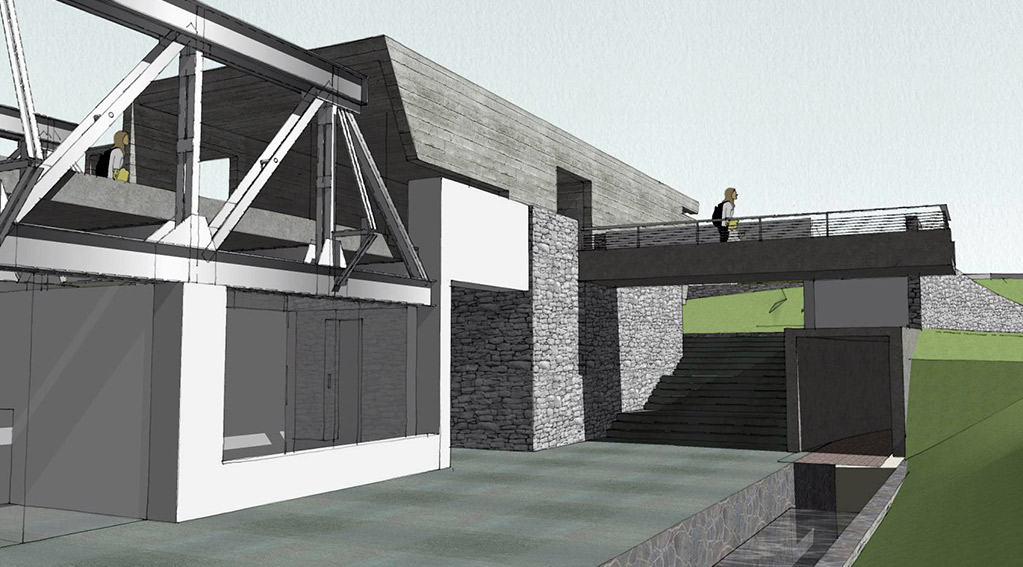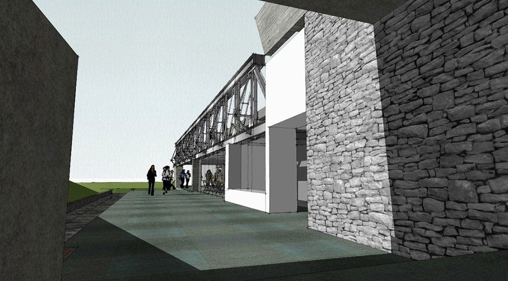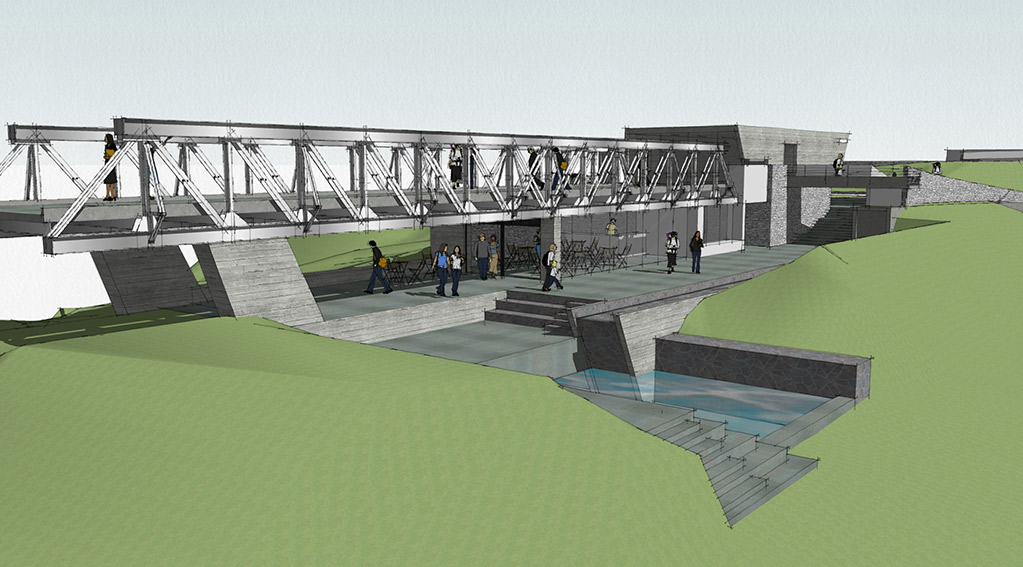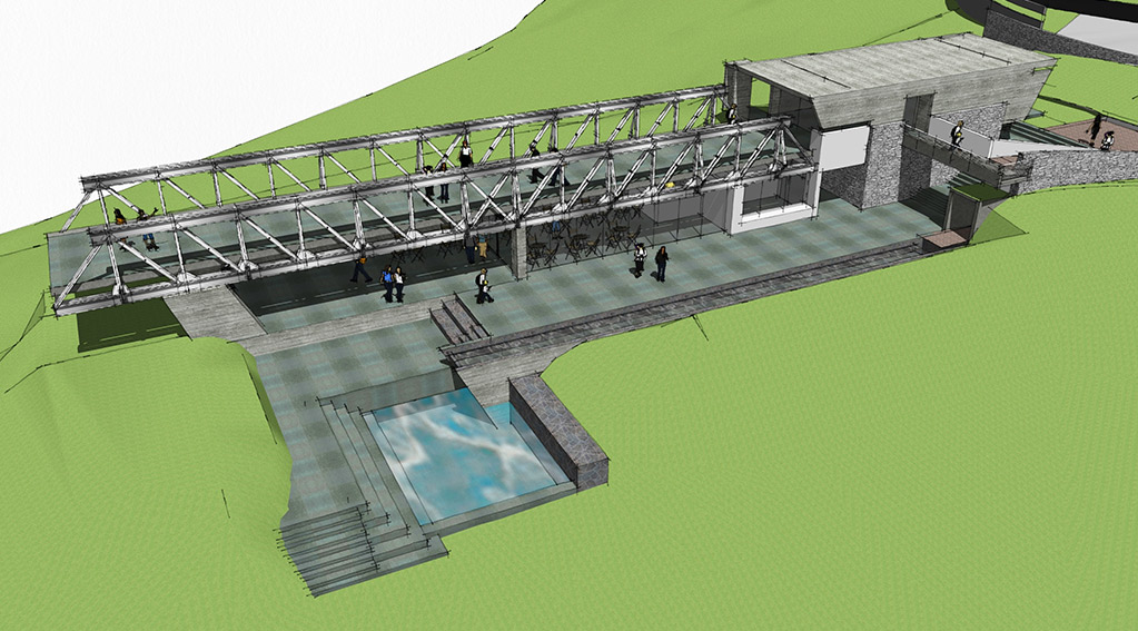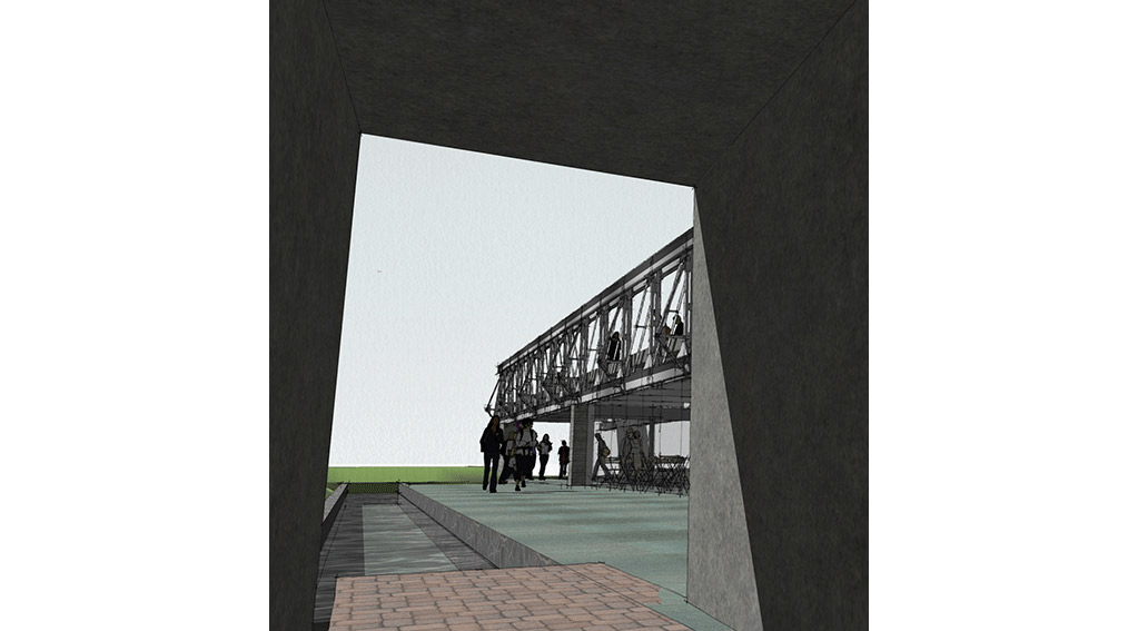 Locating the bridge on a elevated part of the site allowed us to carve out spaces underneath as well as float the bridge accordingly. One end of the bridge is encased in a gallery –showcasing the history of the bridge. The entry to the bridge is only through this gallery – making it one of the exhibits of the gallery even though it bursts out of it on one side. The other end cantilevers out into infinity – into times to come – into the future.